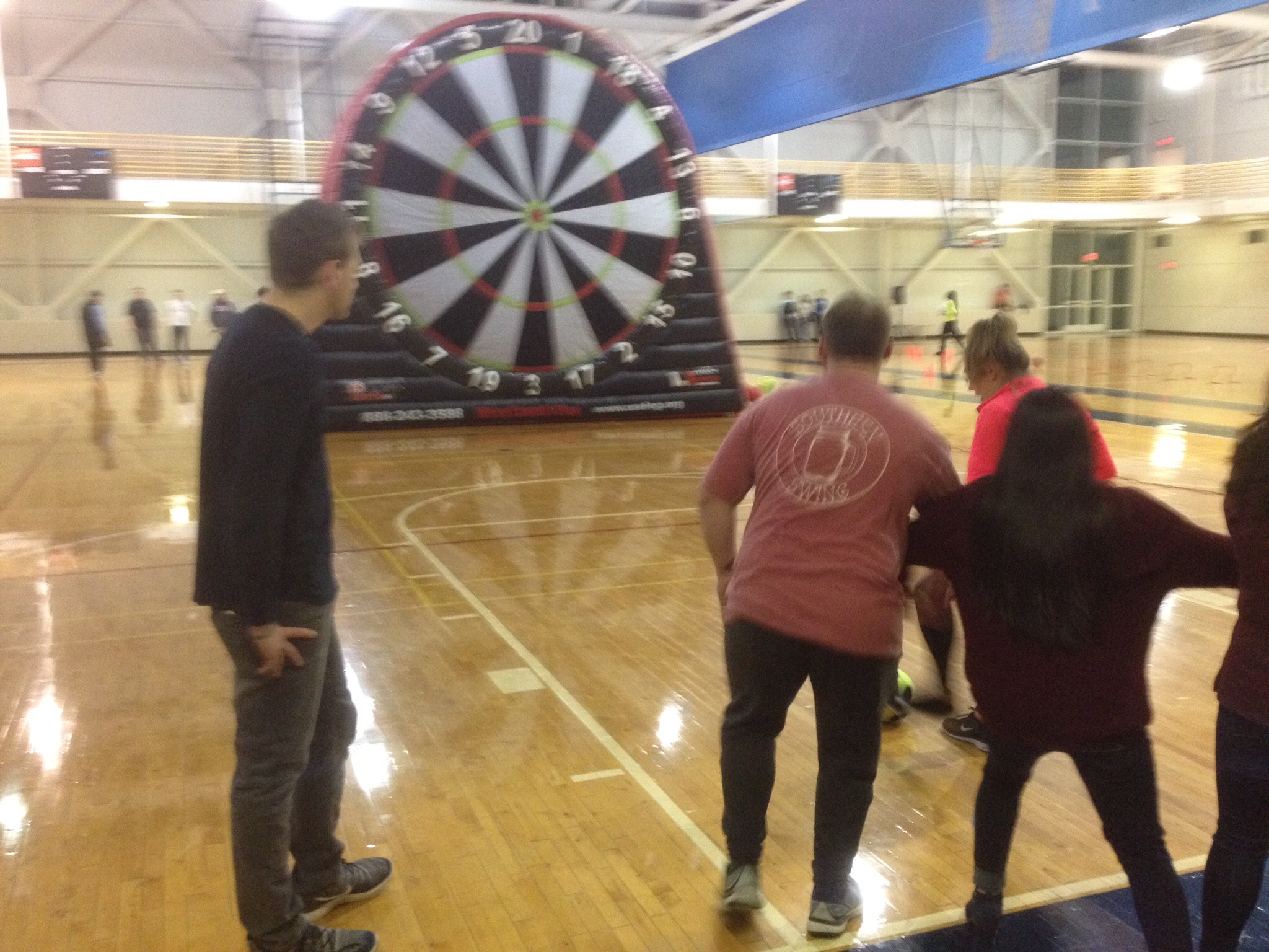 Soccer Darts is an innovative hybrid game of soccer and darts. The students will be lining up to kick a velcro-wrapped soccer ball at our 16.5 foot inflatable dart board.